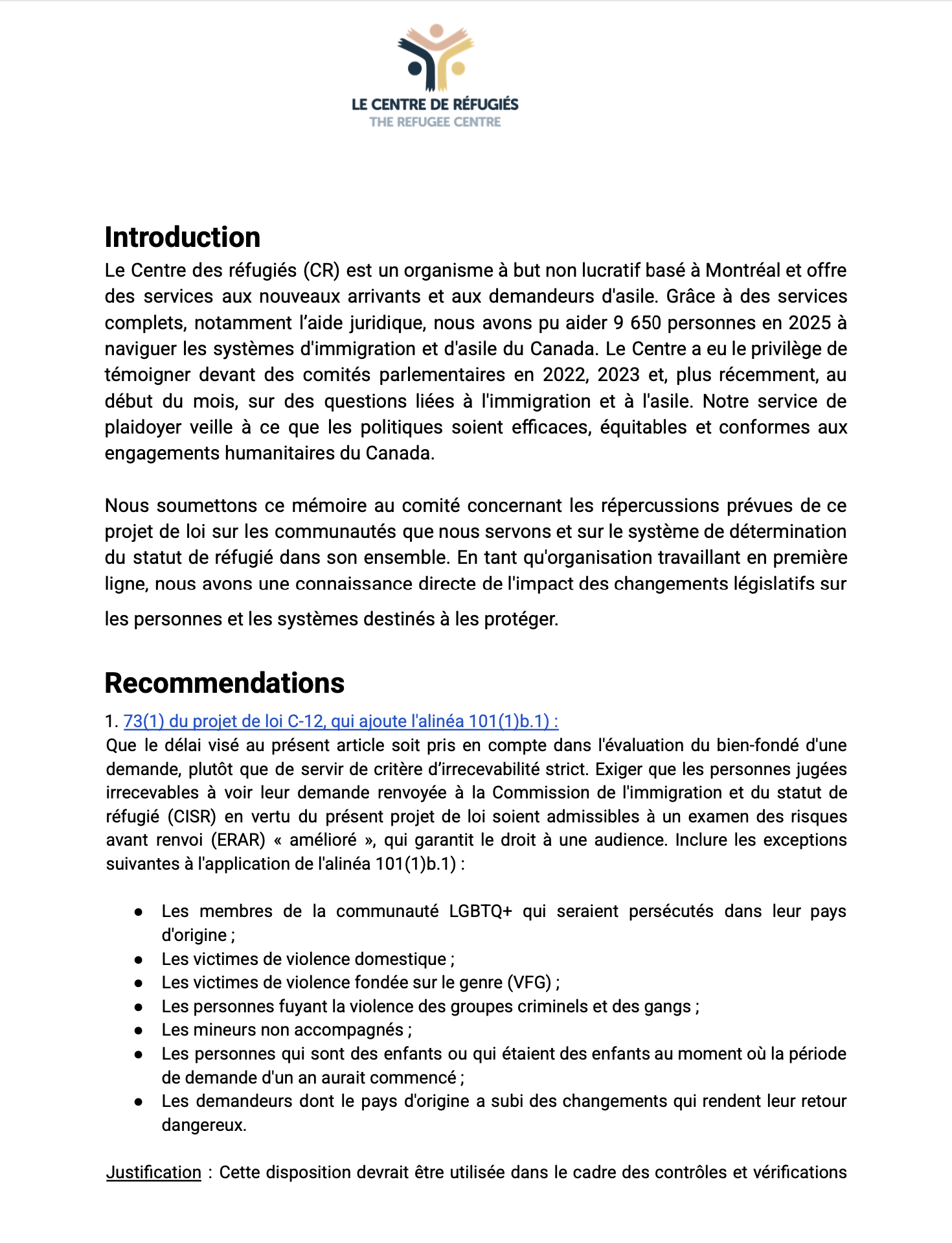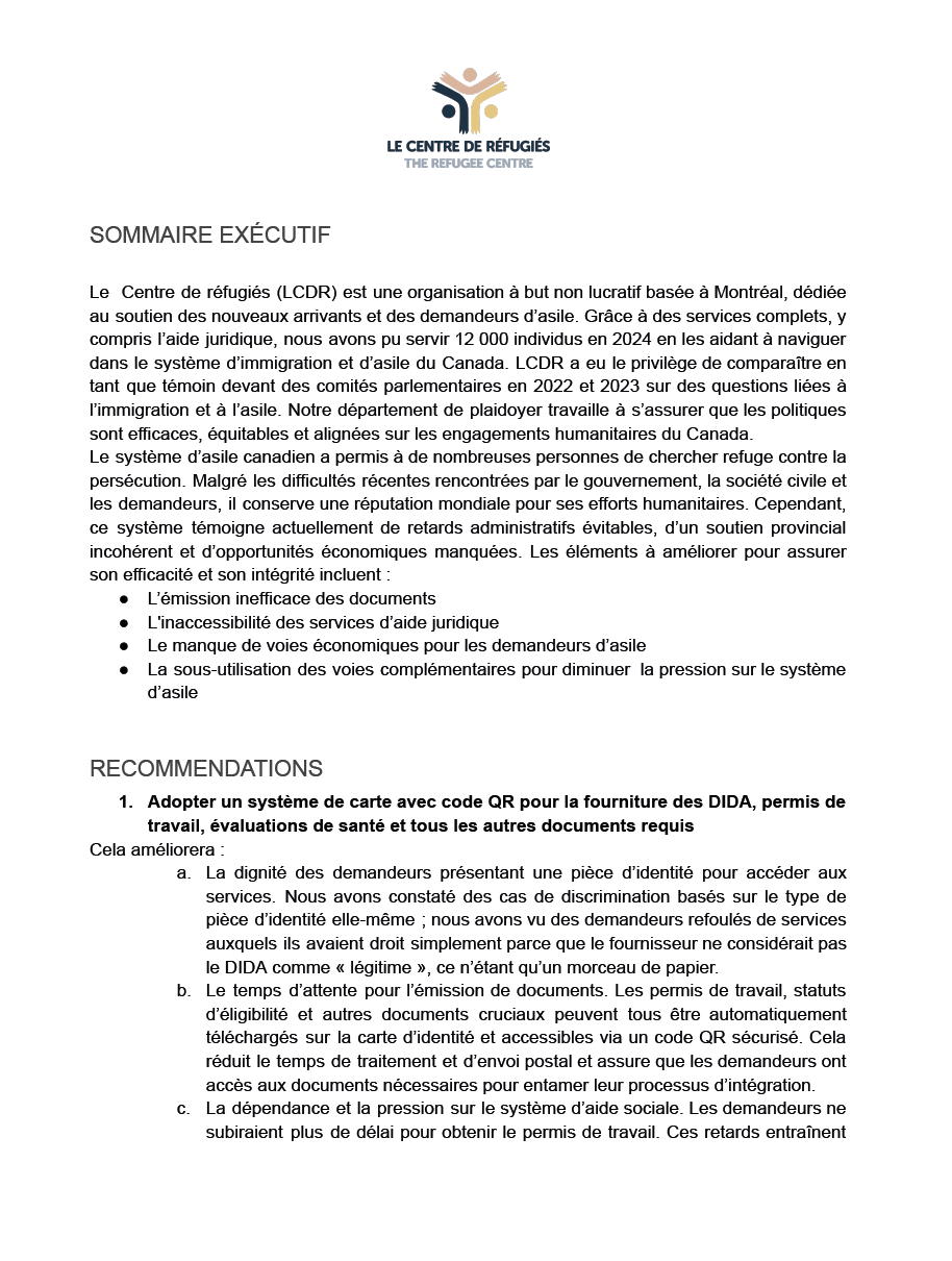 February 2026 — We are submitting this brief to the committee concerning foreseen impacts of this bill on the communities we serve and the refugee determination system as a whole.